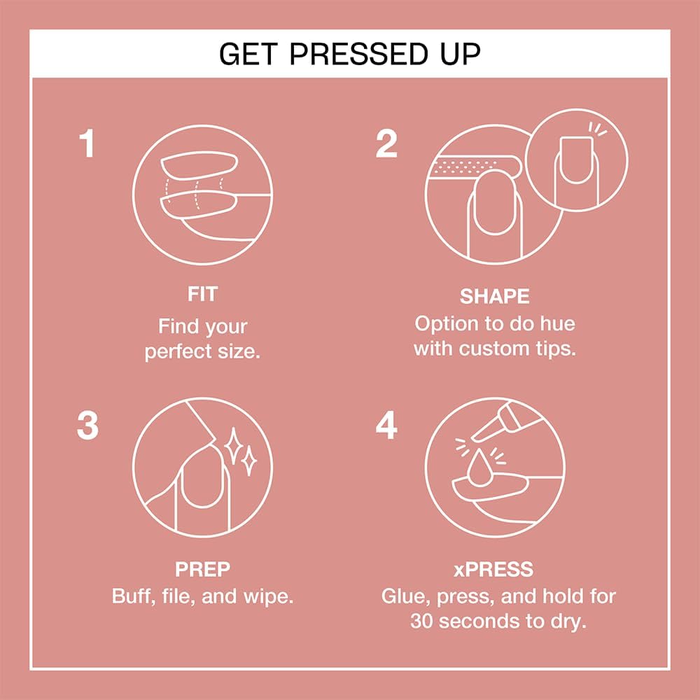 Fit Cover your natural nail with each presson to find your perfect size, ensuring you align the number with your natural nail tip. Shape Do you with custom shapes and lengths using the Shape Up side of your file. Prep Clip or file nails as needed and lightly buff your nail surface. Remove dust and debris from nails with the Prep to xPRESS pad, the gently push back cuticles. xPRESS Remove glue cap and gently squeeze the bottle. For longer wear, apply glue to the back of your presson nail and your natural nail. For short term wear, only apply glue to your presson nail. No sweat removal Soak your nails in warm water for 10 minutes and apply a small amount of acetone to nail base using a cotton swab. Then gently lift pressons with your Cuticle Stick