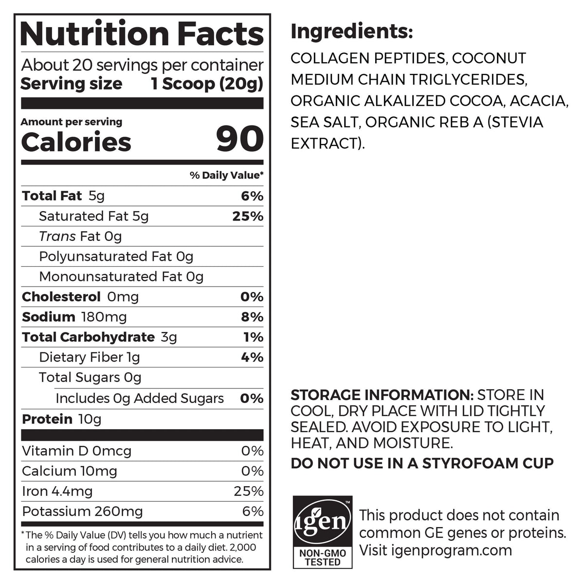 Ingredients: Collagen Peptides, Coconut Medium Chain Triglycerides, Organic Alkalized Cocoa, Acacia, Sea Salt, Organic Reb a Stevia Extract.