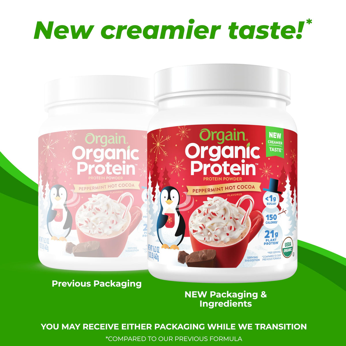 Orgain Organic Vegan Protein Powder, Peppermint Hot Cocoa Holiday Flavor - 21g of Plant Protein, 5g Prebiotic Fiber, No Lactose Ingredients, No Added Sugar, Non-GMO, For Shakes & Smoothies, 1.02 lb