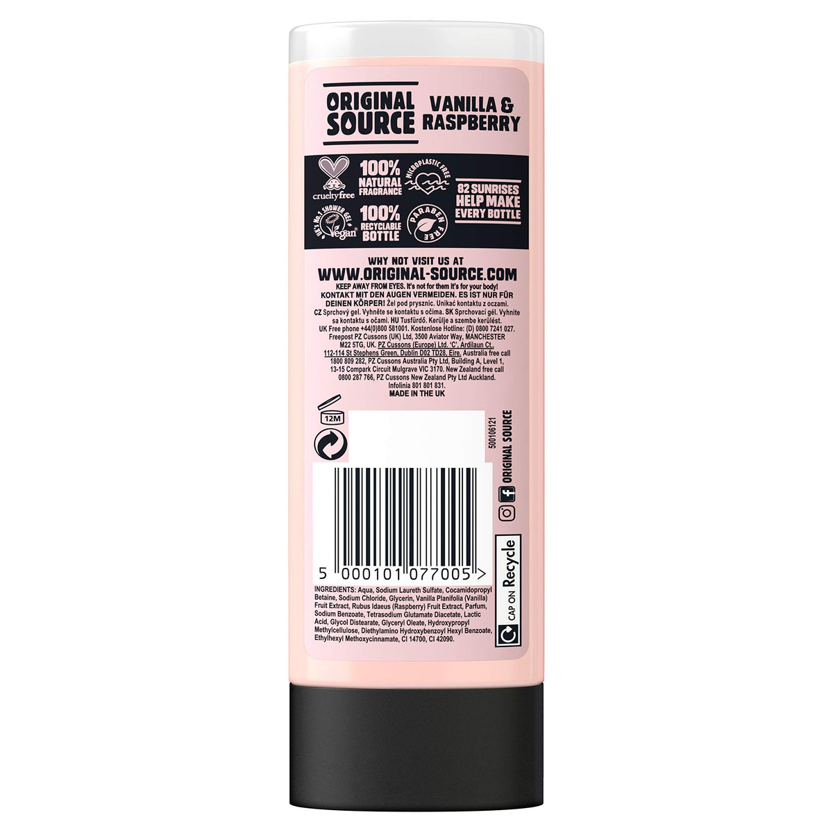 Indulge in the luxurious scent of Original Source Vanilla & Raspberry Shower Gel. This vegan and cruelty-free formula cleanses your skin while leaving a natural fragrance.