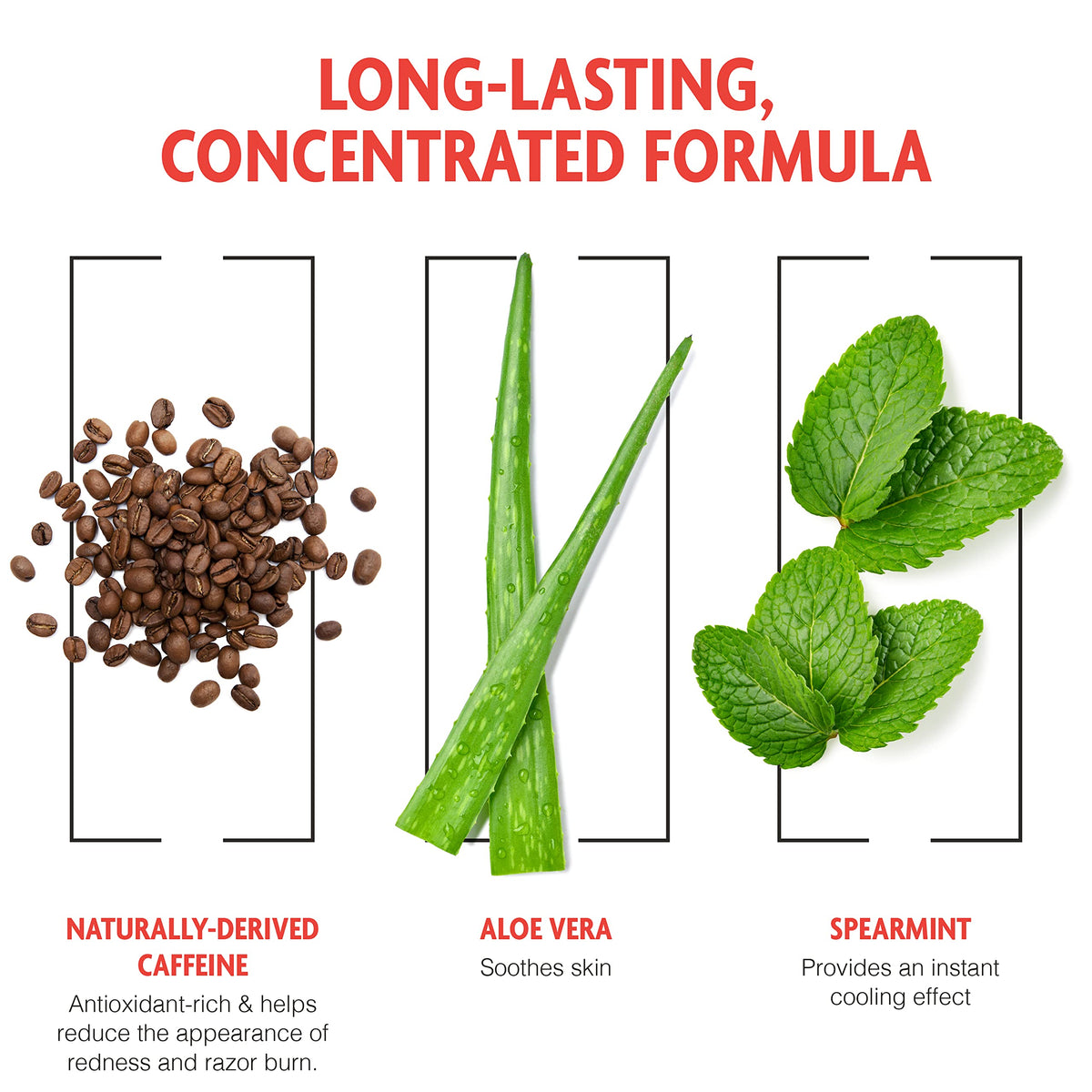 Ingredients: Water, Potassium myristate derived from palm kernel and coconut oils, Potassium stearate derived from vegetable fats and oils, Sodium myristate derived from palm kernel and coconut oils, Sodium stearate derived from vegetable fats and oils, Glycerin vegetablebased, Caffeine, Organic aloe barbadensis leaf juice, Organic shea butter, Organic sunflower seed oil, Spearmint leaf oil, Sorbic acid, Menthol, Tocopheryl acetate Vitamin E, Hydroxyethylcellulose