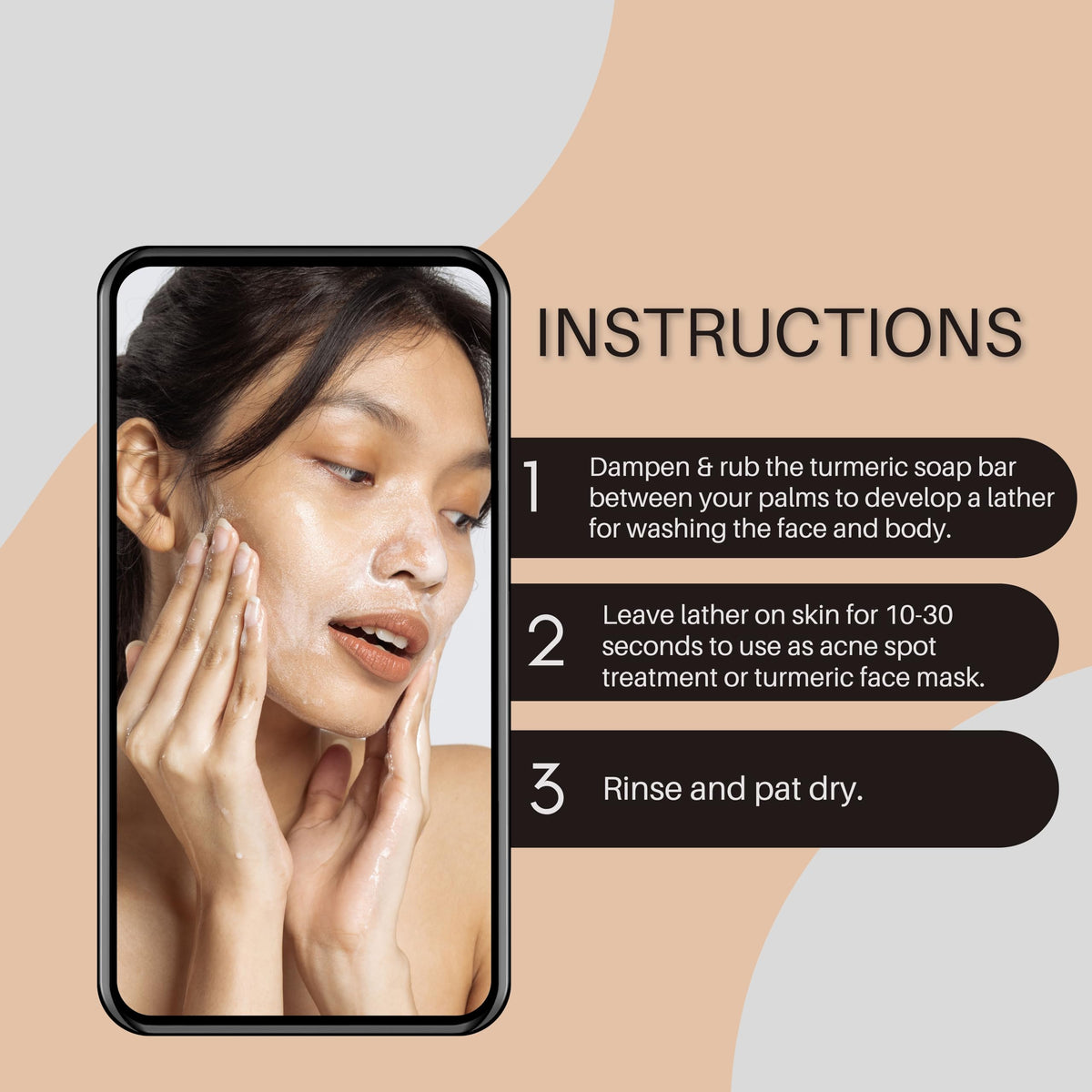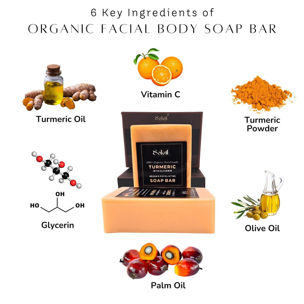 Organic Turmeric Face and Body Soap Bar is enriched with vitamin C, palm oil, olive oil, and turmeric extracts, offering a luxurious cleansing experience that brightens and nourishes the skin, complemented with a bamboo wooden soap dish tray for a thoughtful gift set.