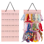 The Baby Headband Organizer is a large capacity holder for baby girl's hair accessories. Keep hair bows and clips organized with this pink hanging organizer.