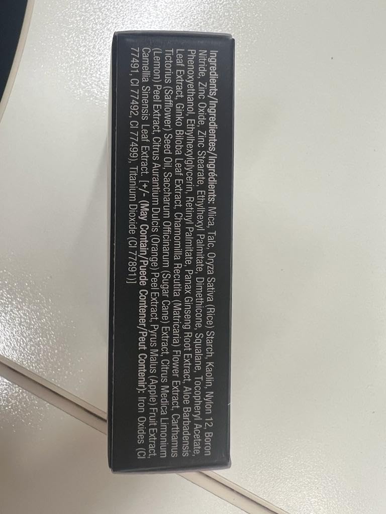 Ingredients: Talc, Mica, Lauroyl Lysine, Oryza Sativa Rice Starch, Nylon12, Magnesium Stearate, Boron Nitride, Ethylhexyl Palmitate, Squalane, Zinc Oxide, Dimethicone, Sodium Hyaluronate, Tocopheryl Acetate, Retinyl Palmitate, Ethylhexyl Methoxycinnamate, Yeast Extract, Water, Saccharum Officinarum Sugar Cane Extract, Citrus Medica Limonium Extract, Citrus Aurantium Dulcis Extract, Pyrus Malus Apple Fruit Extract, Camellia Sinensis Leaf Extract, Phenoxyethanol, Panax Ginseng Root Extract, Carthamus Tinctorius Safflower Seed Oil, Ginkgo Biloba Leaf Extract, Chamomilla Recutita Matricaria Extract, Imidazolidinyl Urea, Methylparaben, Ethylparaben, Propylparaben, Ascorbyl Palmitate. May contain Titanium Dioxide, Iron Oxides, Chromium Oxide Greens, and Ultramarine Blue.