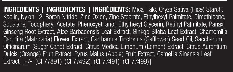 Ingredients: Talc, Mica, Lauroyl Lysine, Oryza Sativa Rice Starch, Nylon12, Magnesium Stearate, Boron Nitride, Ethylhexyl Palmitate, Squalane, Zinc Oxide, Dimethicone, Sodium Hyaluronate, Tocopheryl Acetate, Retinyl Palmitate, Ethylhexyl Methoxycinnamate, Yeast Extract, Water, Saccharum Officinarum Sugar Cane Extract, Citrus Medica Limonium Extract, Citrus Aurantium Dulcis Extract, Pyrus Malus Apple Fruit Extract, Camellia Sinensis Leaf Extract, Phenoxyethanol, Panax Ginseng Root Extract, Carthamus Tinctorius Safflower Seed Oil, Ginkgo Biloba Leaf Extract, Chamomilla Recutita Matricaria Extract, Imidazolidinyl Urea, Methylparaben, Ethylparaben, Propylparaben, Ascorbyl Palmitate. May contain Titanium Dioxide, Iron Oxides, Chromium Oxide Greens, and Ultramarine Blue.
