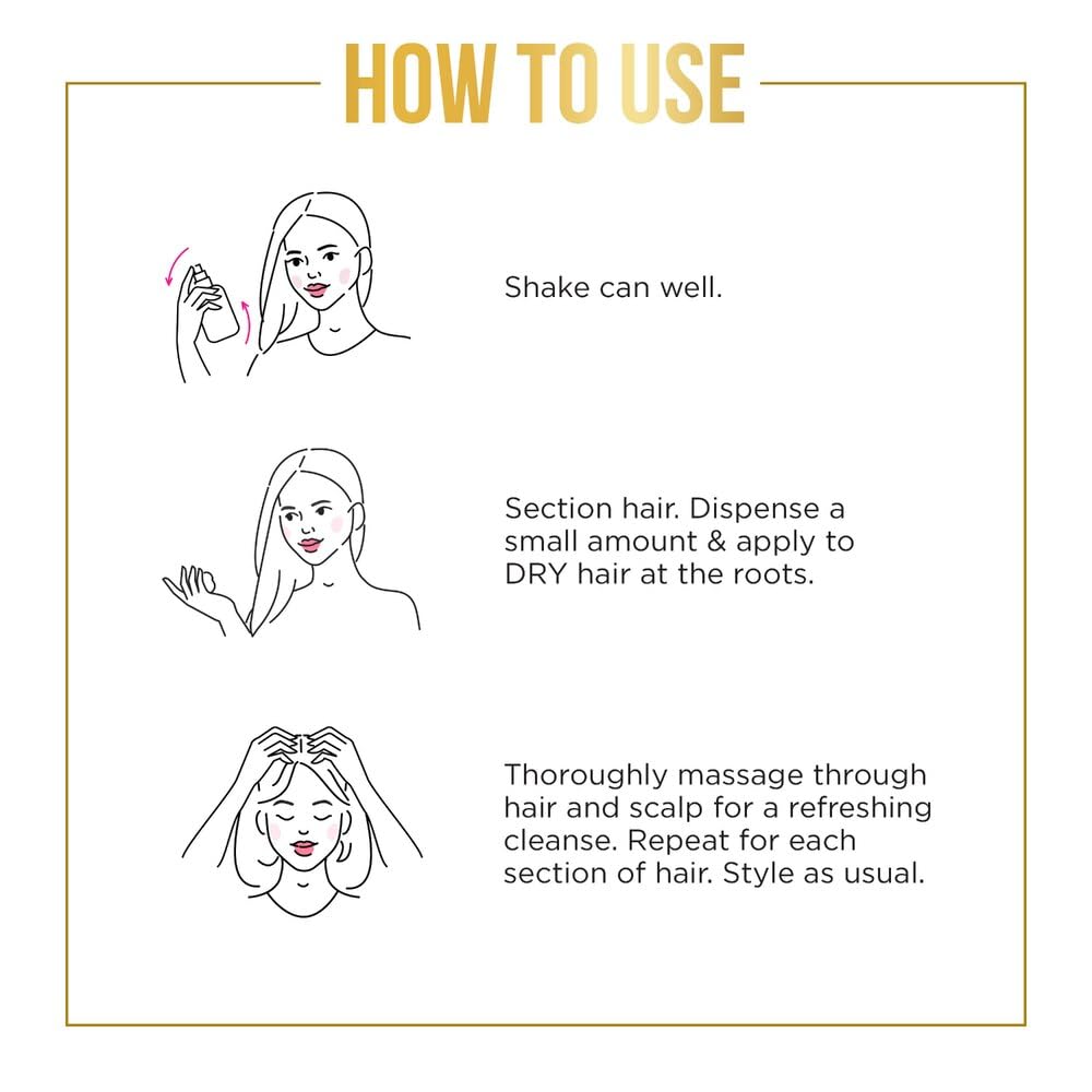 Apply product to dry hair for 60 seconds to refresh and cleanse without water.