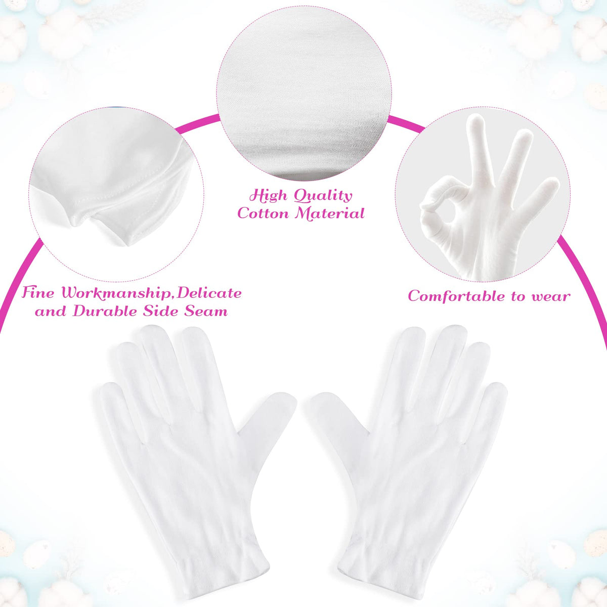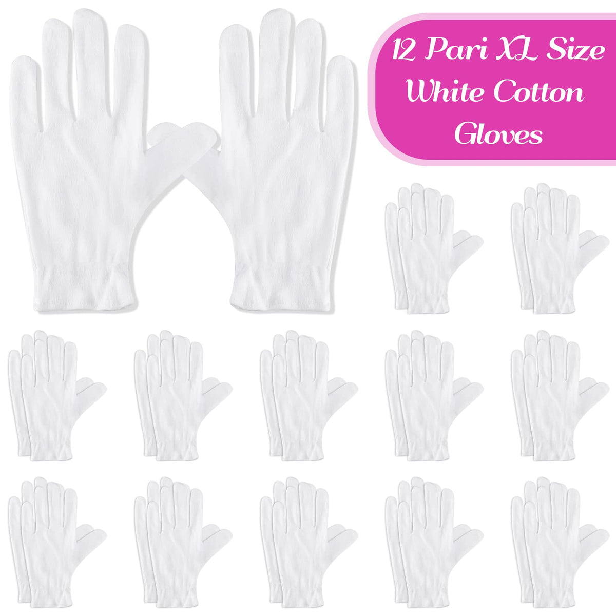 Pamper your hands with Paxcoo 12 Pairs XL White Cotton Gloves. These gloves are perfect for moisturizing, spa treatments, and jewelry inspection, providing a soft and comfortable fit for various hand care needs.