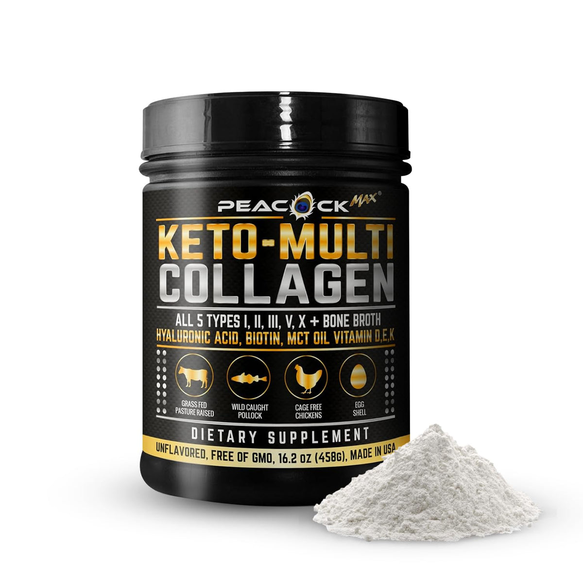 Peacock Max Keto Multi Collagen Peptides 16.2 oz - Bone Broth Protein Powder, 5 Types Hydrolyzed Collagen, MCT Oil, Biotin & Electrolytes for Joint, Skin, Hair & Gut Health, Unflavored Protein Powder