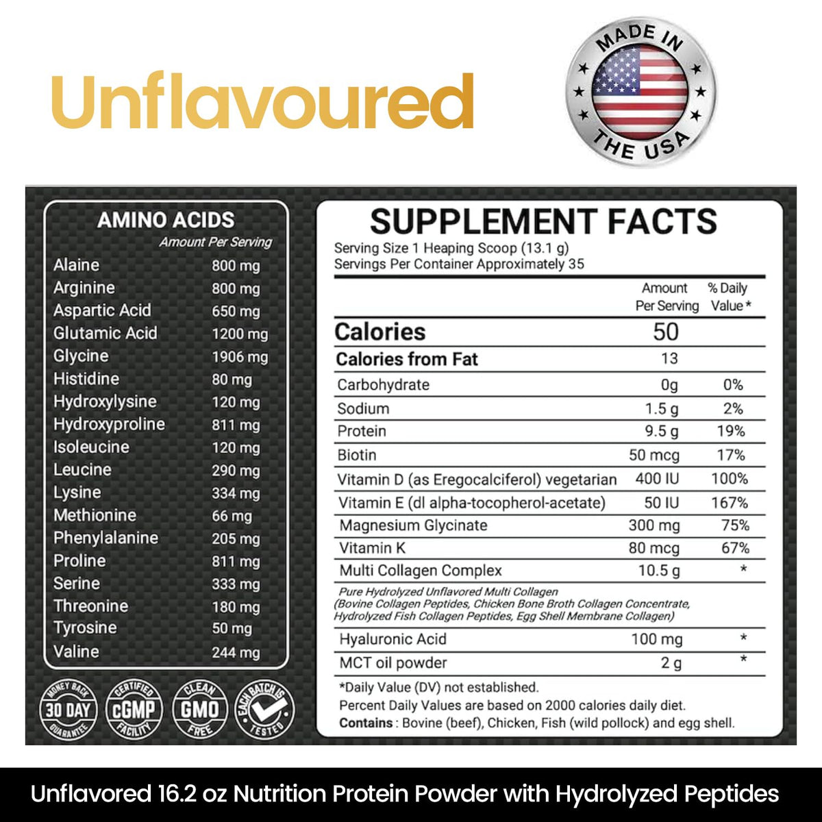 Ingredients :: Multi-Collagen Complex Pure Hydrolyzed Multi Collagen Peptides All 5 types( I,II,III,V,X-Bovine, Fish, Chicken, Egg) + Bone Broth, Coconut MCT Oil Powder, Hyaluronic Acid, Biotin, Vitamin D,E,K