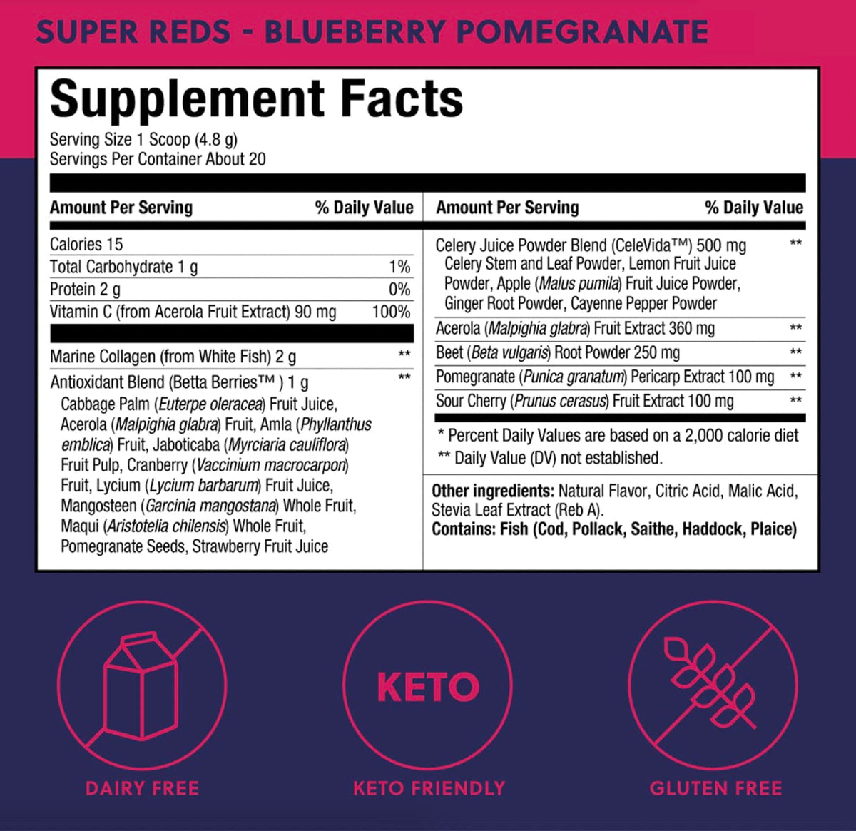 Perfect Keto Super Reds Superfood Powder, Antioxidants Supplement with Fruit & Vegetable Powder, Polyphenols & Marine Collagen, Drink Mix for Skin & Energy Support, Blueberry Pomegranate, 20 Servings