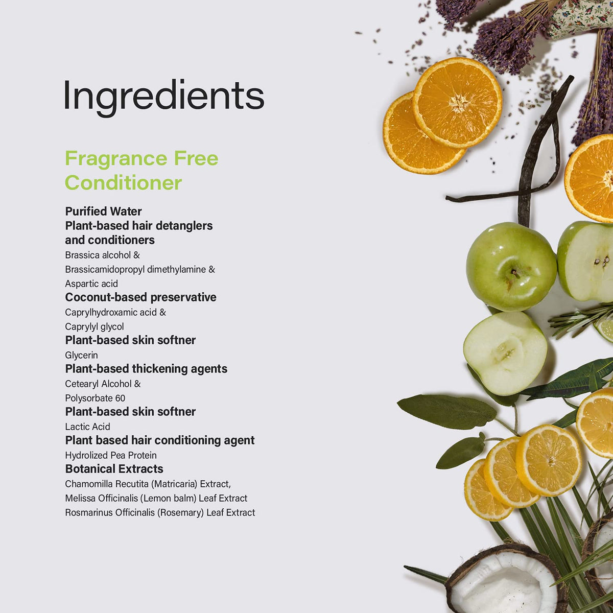 Ingredients: Purified Water Aqua, Brassica alcohol Brassicamidopropyl dimethylamine Aspartic acid, Caprylhydroxamic acid Caprylyl glycol Glycerin, Cetearyl Alcohol Polysorbate 60, Apple Cider Vinegar, Lactic acid, Hydrolyzed Pea Protein, Chamomilla Recutita Matricaria Extract, Melissa Officinalis Lemon balm Leaf Extract, Rosmarinus Officinalis Rosemary Leaf Extract