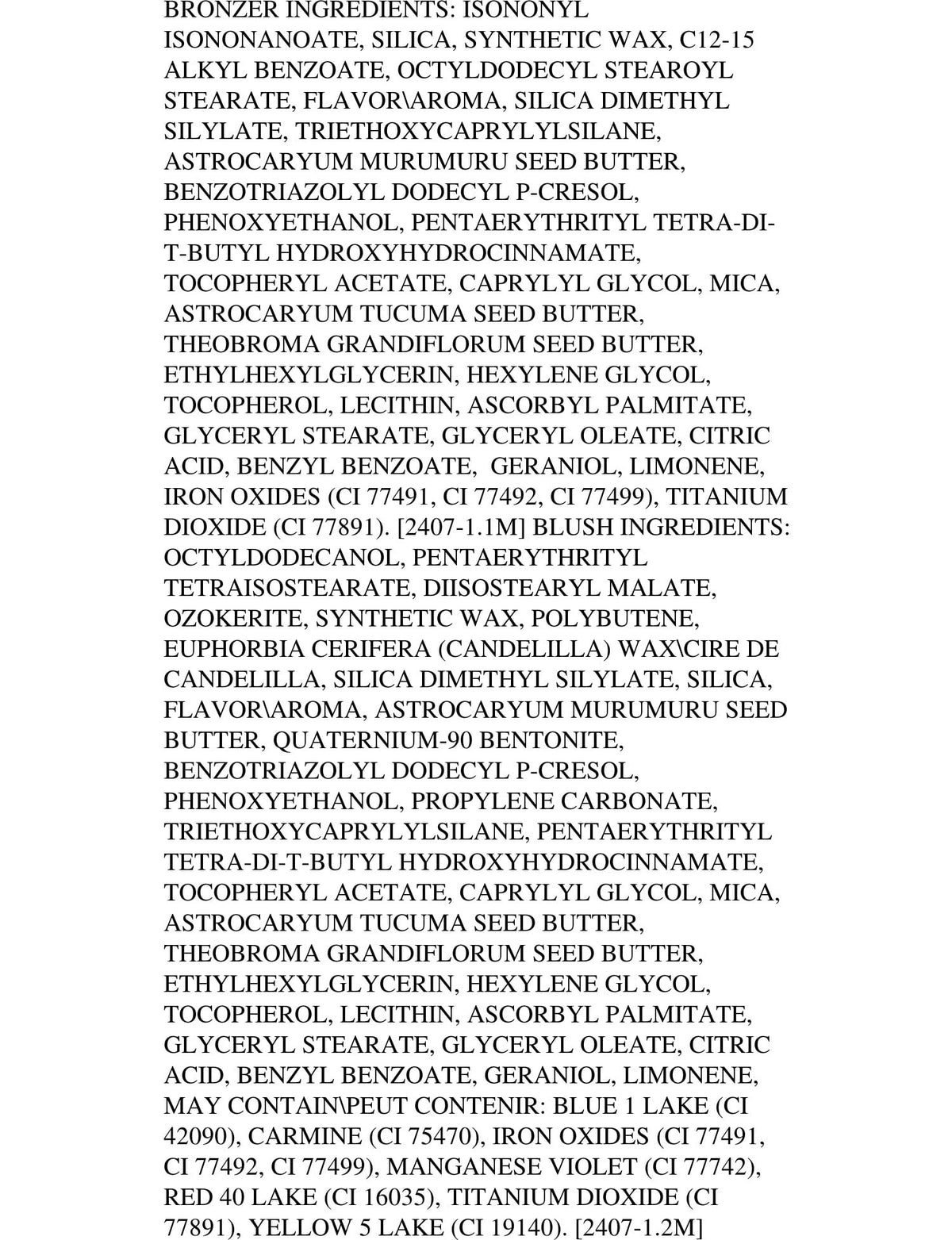 Ingredients :: BRONZER INGREDIENTS: ISONONYL ISONONANOATE, SILICA, SYNTHETIC WAX, C12-15 ALKYL BENZOATE, OCTYLDODECYL STEAROYL STEARATE, FLAVOR/AROMA, SILICA DIMETHYL SILYLATE, TRIETHOXYCAPRYLYLSILANE, ASTROCARYUM MURUMURU SEED BUTTER, BENZOTRIAZOLYL DODECYL P-CRESOL, PHENOXYETHANOL, PENTAERYTHRITYL TETRA-DI-T-BUTYL HYDROXYHYDROCINNAMATE, TOCOPHERYL ACETATE, CAPRYLYL GLYCOL, MICA, ASTROCARYUM TUCUMA SEED BUTTER, THEOBROMA GRANDIFLORUM SEED BUTTER, ETHYLHEXYLGLYCERIN, HEXYLENE GLYCOL, TOCOPHEROL, LECITHIN, ASCORBYL PALMITATE, GLYCERYL STEARATE, GLYCERYL OLEATE, CITRIC ACID, BENZYL BENZOATE, GERANIOL, LIMONENE, IRON OXIDES (CI 77491, CI 77492, CI 77499), TITANIUM DIOXIDE (CI 77891). 2407-1.1M BLUSH INGREDIENTS: OCTYLDODECANOL, PENTAERYTHRITYL TETRAISOSTEARATE, DIISOSTEARYL MALATE, OZOKERITE, SYNTHETIC WAX, POLYBUTENE, EUPHORBIA CERIFERA (CANDELILLA) WAX/CIRE DE CANDELILLA, SILICA DIMETHYL SILYLATE, SILICA, FLAVOR/AROMA, ASTROCARYUM MURUMURU SEED BUTTER, QUATERNIUM-90 BENTONITE, BENZOTRIAZOLYL DODECYL P-CRESOL, PHENOXYETHANOL, PROPYLENE CARBONATE, TRIETHOXYCAPRYLYLSILANE, PENTAERYTHRITYL TETRA-DI-T-BUTYL HYDROXYHYDROCINNAMATE, TOCOPHERYL ACETATE, CAPRYLYL GLYCOL, MICA, ASTROCARYUM TUCUMA SEED BUTTER, THEOBROMA GRANDIFLORUM SEED BUTTER, ETHYLHEXYLGLYCERIN, HEXYLENE GLYCOL, TOCOPHEROL, LECITHIN, ASCORBYL PALMITATE, GLYCERYL STEARATE, GLYCERYL OLEATE, CITRIC ACID, BENZYL BENZOATE, GERANIOL, LIMONENE, MAY CONTAIN/PEUT CONTENIR: BLUE 1 LAKE (CI 42090), CARMINE (CI 75470), IRON OXIDES (CI 77491, CI 77492, CI 77499), MANGANESE VIOLET (CI 77742), RED 40 LAKE (CI 16035), TITANIUM DIOXIDE (CI 77891), YELLOW 5 LAKE (CI 19140). 2407-1.2M
