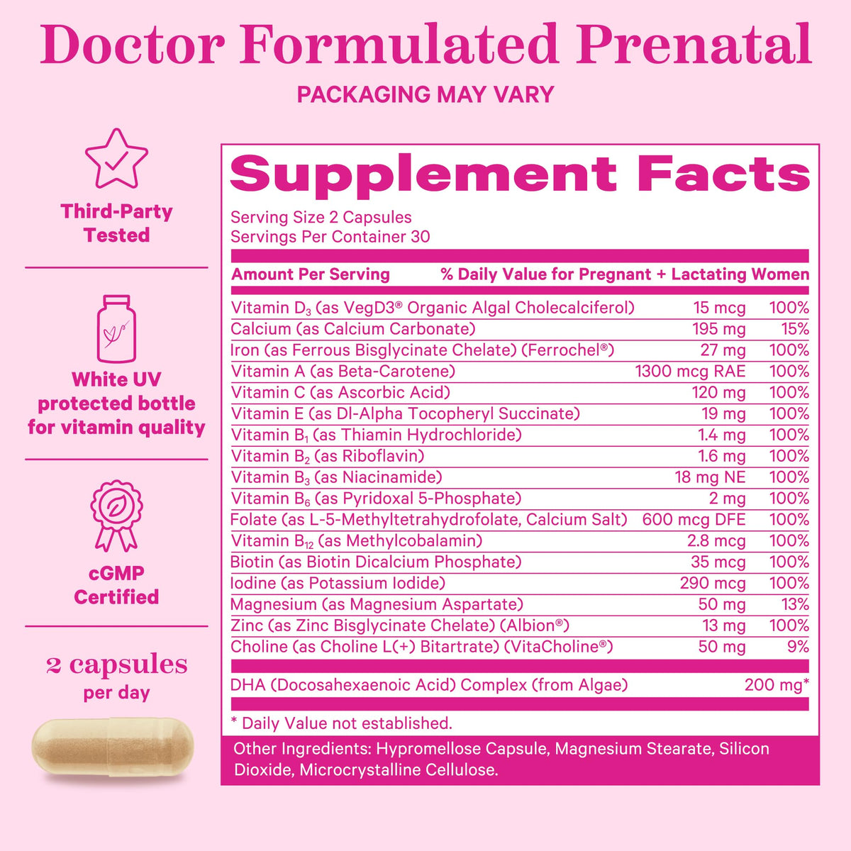 Ingredients :: Vitamin A, Vitamin C, Vitamin D, Vitamin E, Thiamin, Riboflavin, Niacin, Vitamin B6, Folate, Vitamin B12, Biotin, Calcium, Iron, Iodine, Magnesium, Zinc, DHA, Hydroxypropyl Methylcellulose (Vegetarian Capsule), Microcrystalline Cellulose (Plant Fiber), Magnesium Stearate (VegetableSource), Silicon Dioxide. *See Supplement Panel