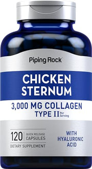 Revitalize your joints with Piping Rock Chicken Sternum Type II Collagen Supplement. This 3000mg formula in 120 capsules includes hyaluronic acid for added joint support, all in a non-GMO, gluten-free blend.