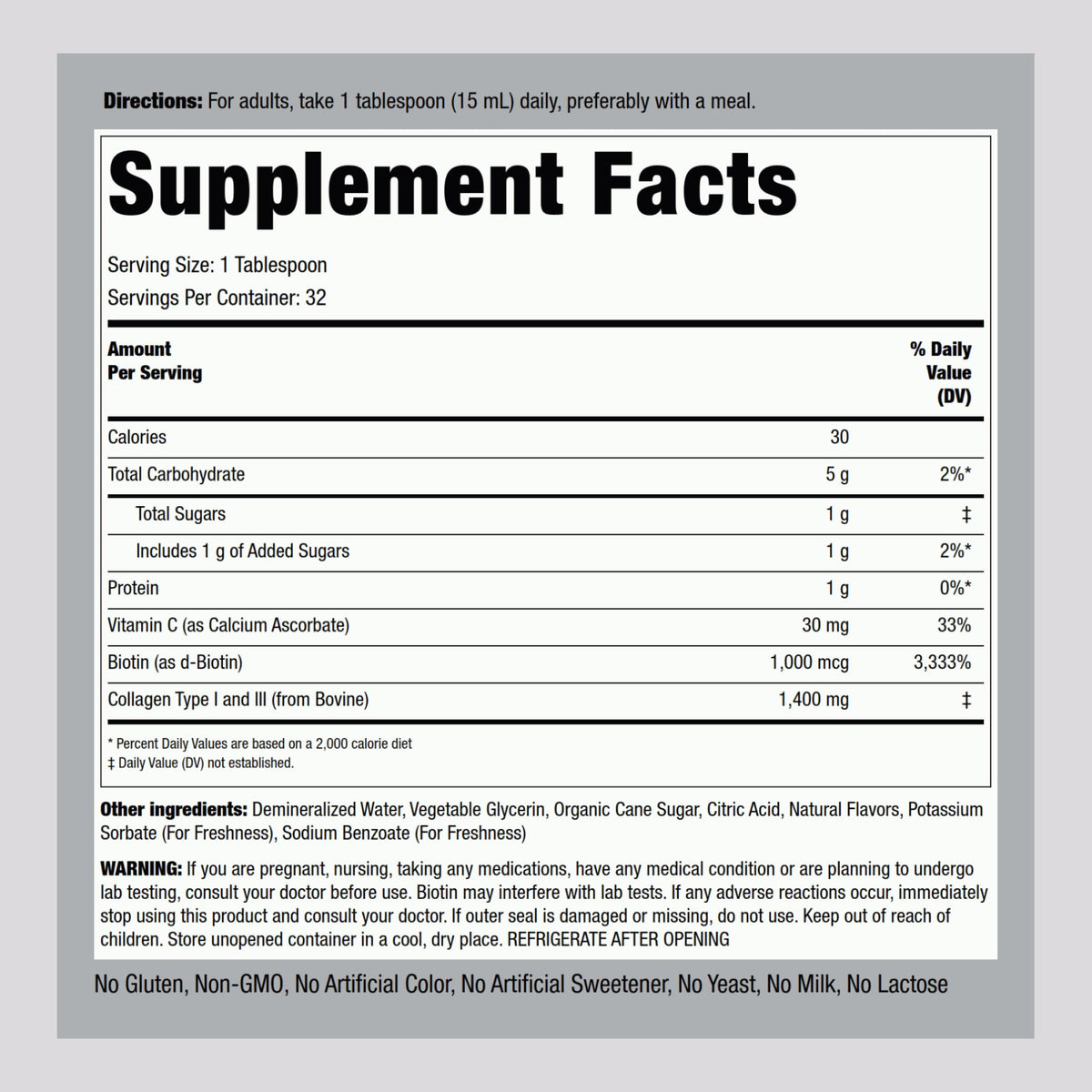 Piping Rock Liquid Collagen and Biotin is a premium beauty formula supplement in a delicious berry flavor. This Type 1 and 3 collagen blend offers non-GMO and gluten-free support for skin, hair, and nail health.