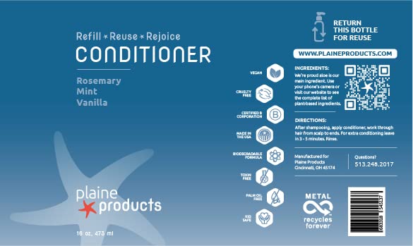 Plaine Products Eco-Friendly Conditioner in Rosemary, Mint, Vanilla is a sulfate-free formula in a refillable bottle with a pump, offering a refreshing and environmentally conscious hair care solution.