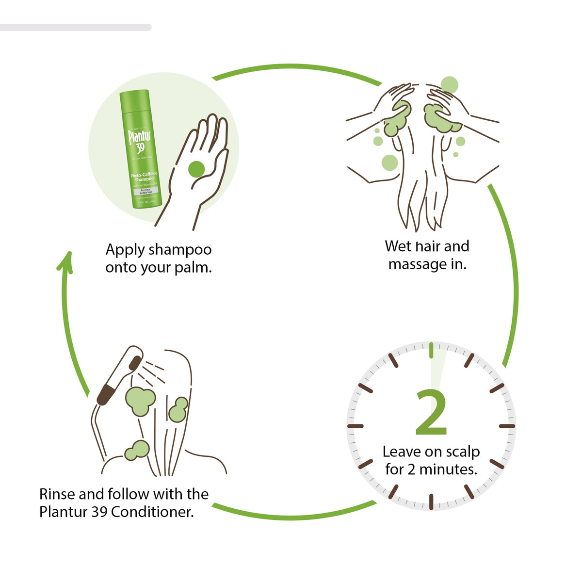 1. Wet hair, apply PhytoCaffeine Shampoo, massage in and leave on scalp for two minutes, rinse. 2. Apply Plantur 39 Conditioner, let it sit, then rinse. Use daily for best results.