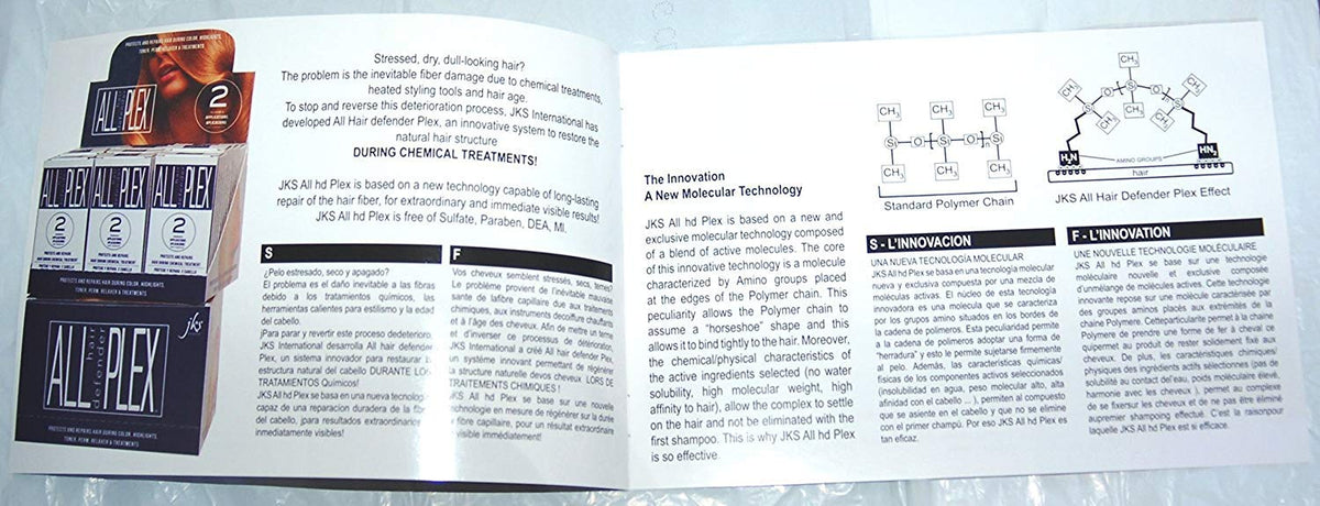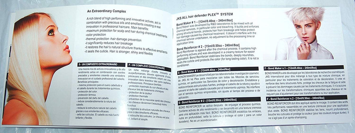 Prevents Damage and Breakage caused by hair bleaching, coloring. PLEX Kit contains 1 12ml 0.40 fl oz Bond Maker 1, 1 15ml 0.50 fl oz Bond Reinforcer 2, Shampoo and Conditioner contain some of the same selected amino acid groups found in the ALL hair defender PLEX treatment. 2 Application Kit medium to short hair, long thick hair 1 App. Easy and Fast to use with color, bleach, perms, relaxer straighteners to protect and repair the hair. Can also be used outside of chemical services as a strengthening treatment. Comes with large info booklet in English, Spanish French Languages. Builds and enforces strong structural bonds, reduces breakage by 98. Does not interfere with the chemical service, compatible with all brands. Does not require alterations to developer strength or timing of any bleach or hair color brand. Professional strength treatment. Free of Sulfates, Parabens, DEA, MI. Never tested on animals.