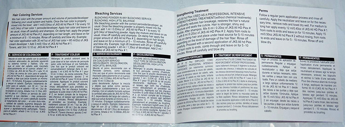 Directions :: Prevents Damage and Breakage caused by hair bleaching, coloring. PLEX Kit contains 1 – 12ml / 0.40 fl oz Bond Maker #1, 1 – 15ml / 0.50 fl oz Bond Reinforcer #2, Shampoo and Conditioner contain some of the same selected amino acid groups found in the ALL hair defender PLEX treatment. 2 Application Kit (medium to short hair, long & thick hair 1 App.) Easy and Fast to use with color, bleach, perms, relaxer / straighteners to protect and repair the hair. Can also be used outside of chemical services as a strengthening treatment. Comes with large info booklet in English, Spanish & French Languages. Builds and enforces strong structural bonds, reduces breakage by 98%. Does not interfere with the chemical service, compatible with all brands. Does not require alterations to developer strength or timing of any bleach or hair color brand. Professional strength treatment. Free of Sulfates, Parabens, DEA, MI. Never tested on animals.