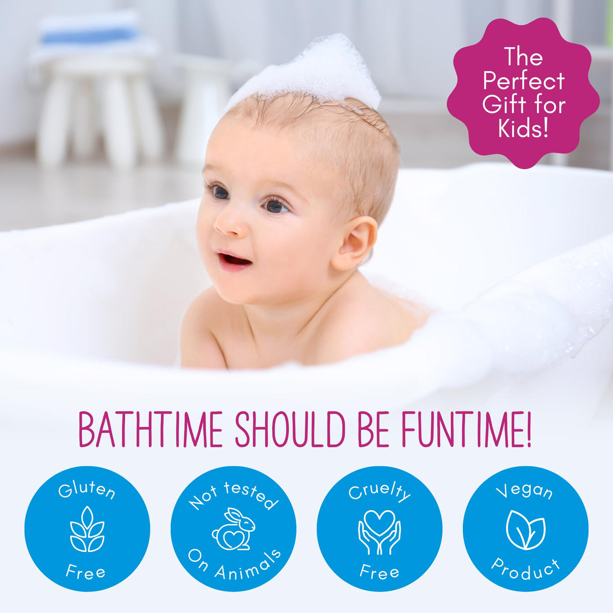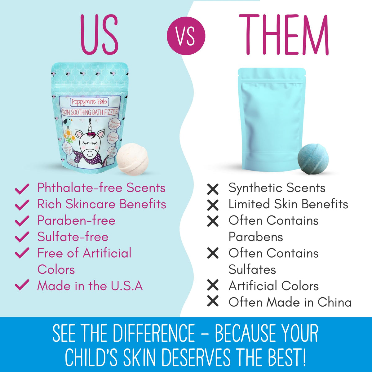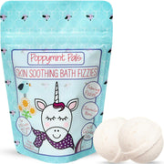 Poppymint Pals Foaming Bath Fizzies in Skin Soothing Chamomile Bloom scent offer a natural and calming bath experience for toddlers and kids. These foaming bath bombs contain Epsom salts for a relaxing, soothing, and enjoyable bathtime soak.