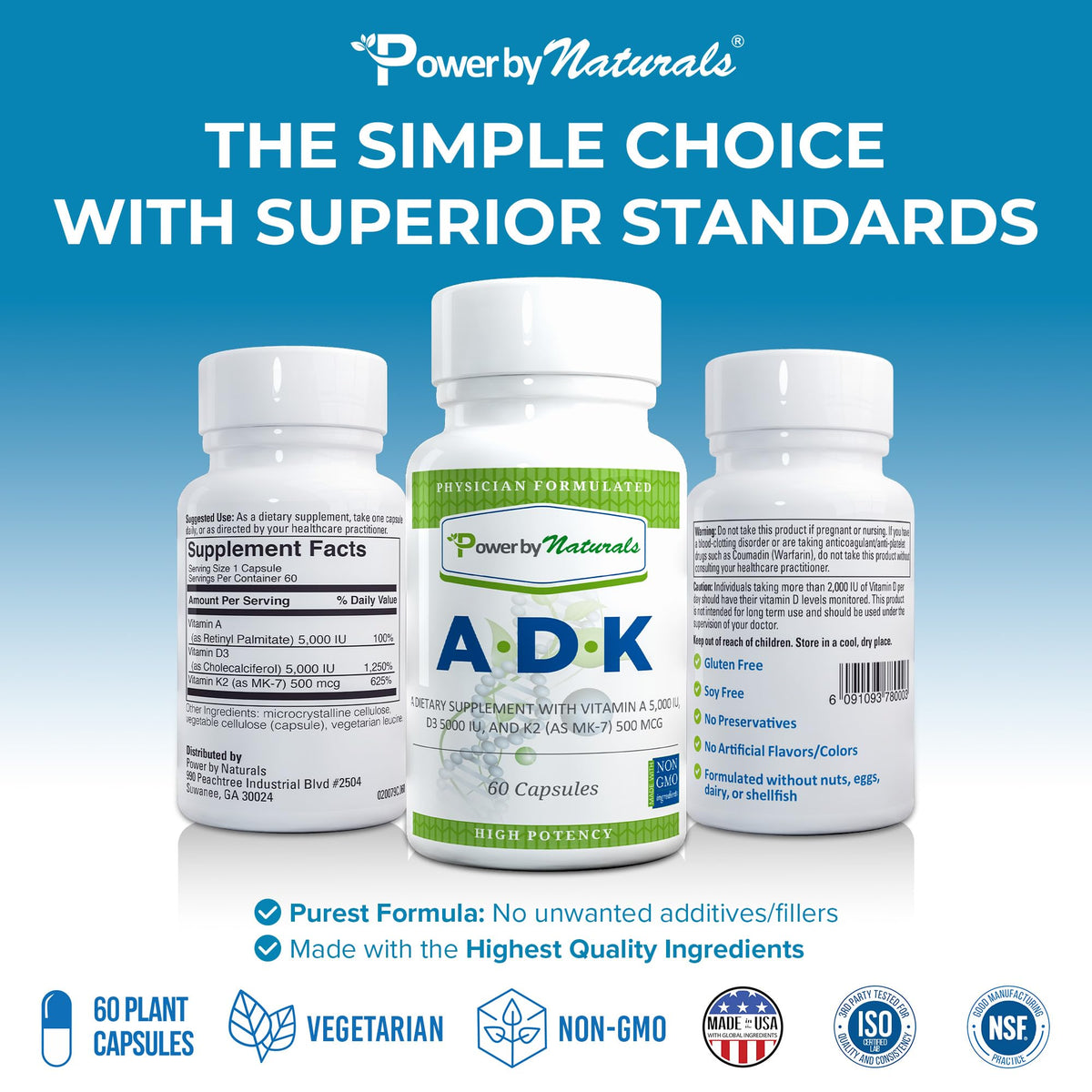 Power By Naturals ADK Vitamin Supplement: Vitamin A, Vitamin D3 5000 iu, and Vitamin K2 MK-7, Support Bone Health Vitamin ADK Supplement, Pure Vitamin D with K & A, 60 Capsules (2 Month Supply)