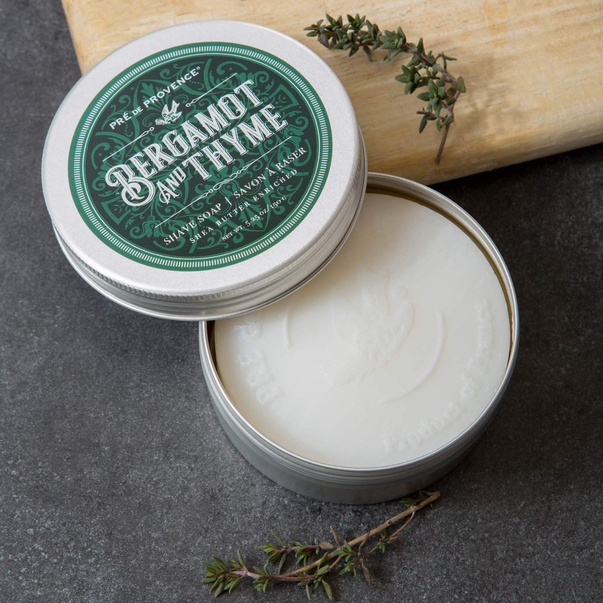 Experience the refreshing scent of Pre de Provence Bergamot & Thyme Men's Fragrance Collection. This shave soap in a tin offers a luxurious grooming experience with a masculine aroma.