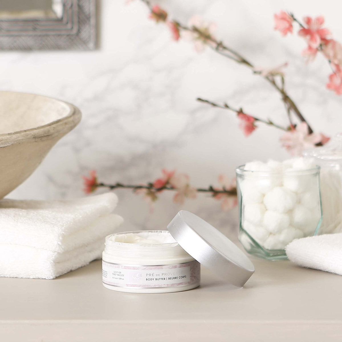 Nourish your skin with Pre de Provence Collection Shea Butter Enriched Body Butter in Lily of the Valley scent. Experience soothing and moisturizing benefits with this luxurious body butter.