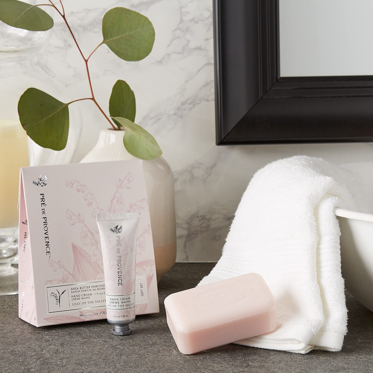 Indulge in the luxurious Pre de Provence Gift Set Collection featuring a 150g Soap Bar and 1 fl oz Hand Cream in the enchanting Lily of the Valley scent. Pamper yourself or gift it to a loved one for a spa-like experience at home.