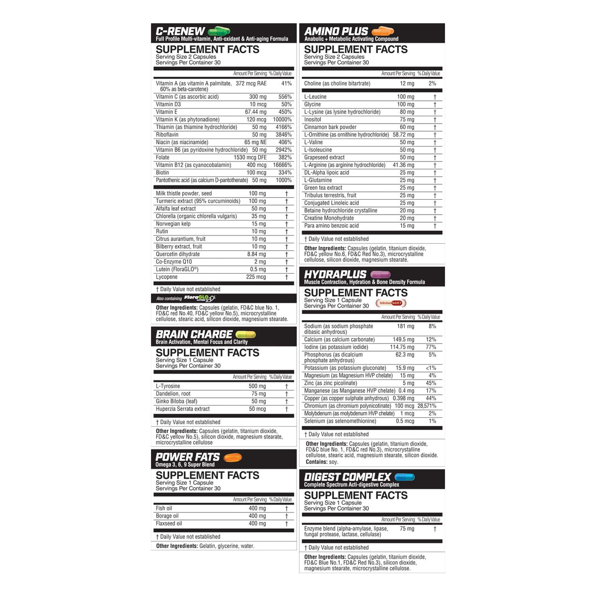 Ingredients: Vitamin A, Vitamin C, Vitamin D3, Vitamin E, Vitamin K1, Vitamin B1, Vitamin B2, Vitamin B3, Vitamin B5, Vitamin b6, Vitamin B7, Vitamin B9, Vitamin B12, Milk thistle Silybum marianum Seed, Turmeric 251 Extract 95 Curcuminoids Curcuma longa Rhizome, Alfalfa 41 Extract 100 mg Dry Medicago sativa Leaf, Chlorella Chlorella vulgaris Whole, Norwegian Kelp 6.375 mcg Iodine Ascophyllum nodosum Thallus, Rutin, Bilberry 101 extract 50 mg Dry Vaccinium myrtillus Fruit, Quercetin Quercetin dihydrate, Hesperidin Citrus aurantium Fruit, Coenzyme Q10, Lutein FloraGLOTagetes erecta Herb flowering oleoresin, Betacarotene, Lycopene Solanum lycopersicum Fruit flesh, LLeucine, Glycine, Llysine lLysine monohydrochloride, Inositol, Lornithine, Lvaline, LIsoleucine, Grape Seed extract 1201 Extract vitis vinifera seed 3g dry 95 proanthocyanidins, Larginine Larginine monohydrochloride, DLalpha lipoic acid, Lglutamine, Green tea 1001 Extract Camellia sinensis leaf 1250 mg dry 30 EGCG, 90 polyphenols, Tribulus 101 Extract Tribulus terrestris Fruit 45 Saponins, 125 mg dry, Conjugated Linoleic Acid, Betaine Hydrochloride, Creatine Monohydrate, PABA paraAminobenzoic acid, Choline, Calcium Calcium carbonate, calcium phosphate dibasic, Phosphorus Calcium phosphatedibasic, sodium phosphate dibasic, Potassium potassium gluconate, Magnesium magnesium HVP chelate, Zinc zinc picolinate, Manganese manganese II HVP chelate, Copper copper II sulfate, Iodine potassium iodide, Chromium Chromium III nicotinate, Molybdenum molubdenum VI HVP chelate, Selenium selenomethionine, alphaamylase Aspergillus flavus var. oryzae Whole, Triacylglycerol lipase Rhizopus oryzae Whole, Fungal protease Aspergillus flavus var. oryzae Whole, Lactase Aspergillus flavus var. oryzae Whole, Cellulase Trichoderma longibrachiatum Whole, Ltyrosine, Dandelion Taraxacum officinale Root, Gingko biloba leaf 501 Extract 2500 mg Dry 24 Flavonoid glycosides, 6 Terpene lactones, Toothed clubmoss Huperzia serrata Whole plant 1 Huperzine A, Fish oil Engraulidae, Clupeidae, Scombridae Whole 16 EPA, 10 DHA, Flaxseed Oil Linum usitatissimum Seed 12 LA, 50 ALA, Borage oil Borago officinalis Seed 30 LA, 18 GLA