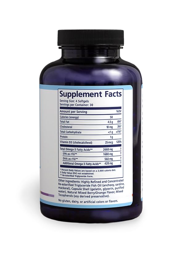 Ingredients: Highly Refined and Concentrated Omega3 Fish Oil anchovy, sardine, mackerel, Capsule Shell gelatin, glycerin, purified water, Natural Mixed BerryOrange Flavor, Natural Mixed Tocopherols soy, and Cholecalciferol.
