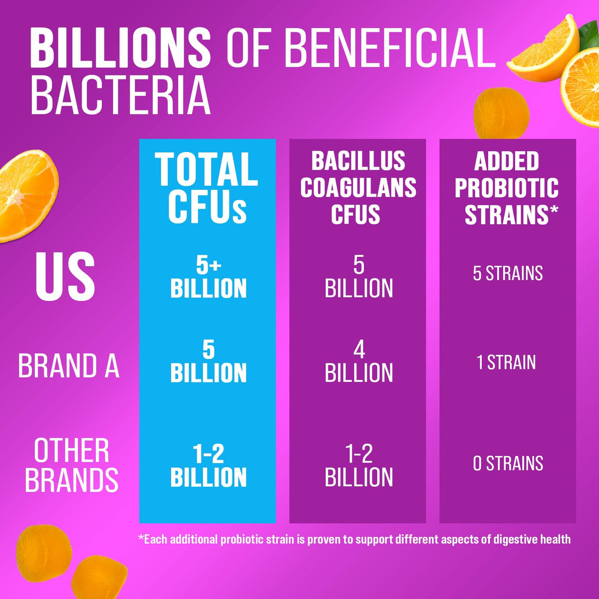 Ingredients :: Bacillus coagulans, Bifidobacterium lactis, Lactobacillus paracasei, Lactobacillus salivarius, Lactobacillus rhamnosus, Lactobacillus acidophilus Other Ingredients: Glucose Syrup, Sugar, Dextrose, Pectin, Citric Acid, Natural Orange Flavor, Vegetable Oil (contains Carnauba Wax), Beta Carotene. Contains: Milk, Soy