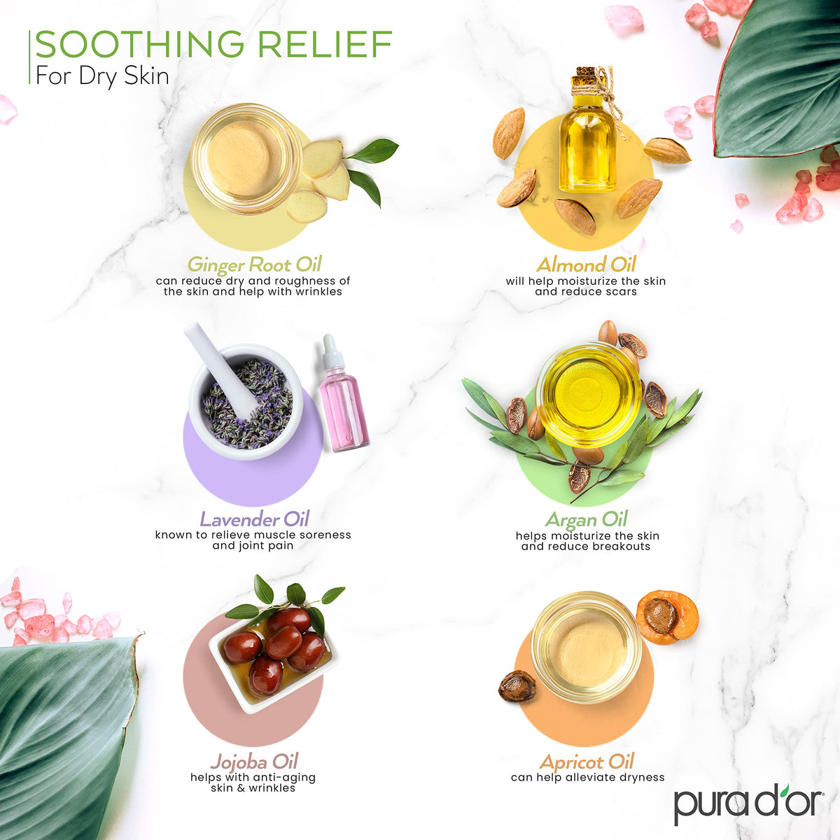PURA D'OR Organic Massage Therapy Oil is a luxurious blend of almond, apricot, argan, ginger, jojoba, and lavender oils that nourish and moisturize the skin. This USDA-certified oil provides silky and softer skin, acting as a body moisturizer and skin lubricant.