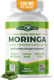 PURA VIDA MORINGA Capsules Single Origin Moringa Powder Organic. Moringa Leaf. Energy, Metabolism, & Immune Support. 120ct. 500mg Caps.