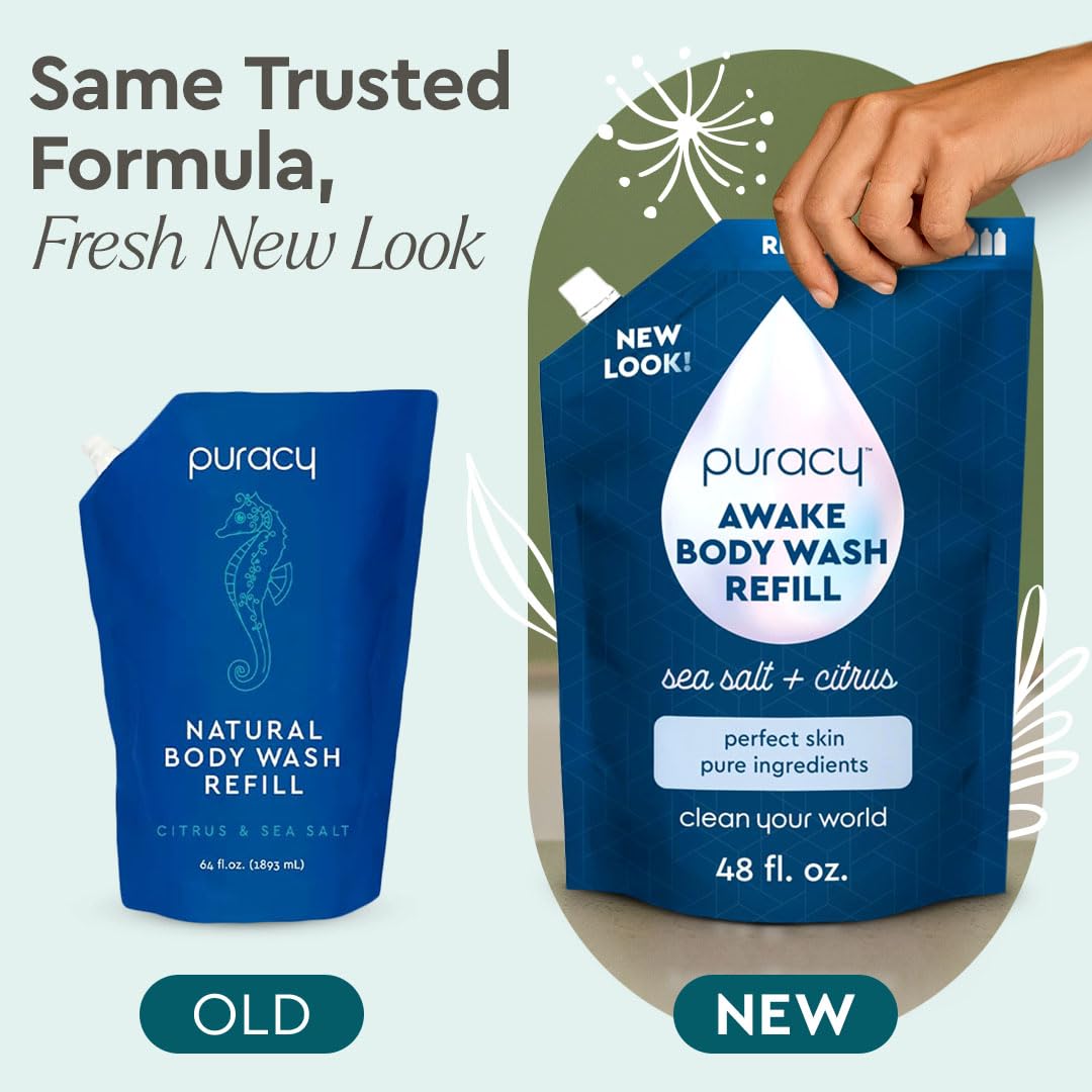 Puracy Body Wash Refill, Natural Body Wash, 98.6% Pure Plant Ingredients, Moisturizing Shower Gel for Women Men Kids, Body Soap for Dry Sensitive Skin Gently Scented with Citrus & Sea Salt, 48 Oz