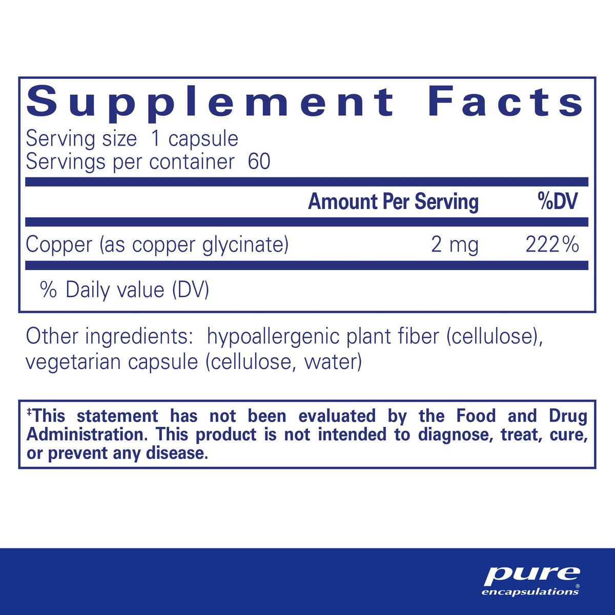 Pure Encapsulations Copper Glycinate 60's is a 2 mg copper supplement that supports red blood cell formation and aids energy metabolism. These non-GMO and vegan capsules come in a pack of 60 for your daily needs.