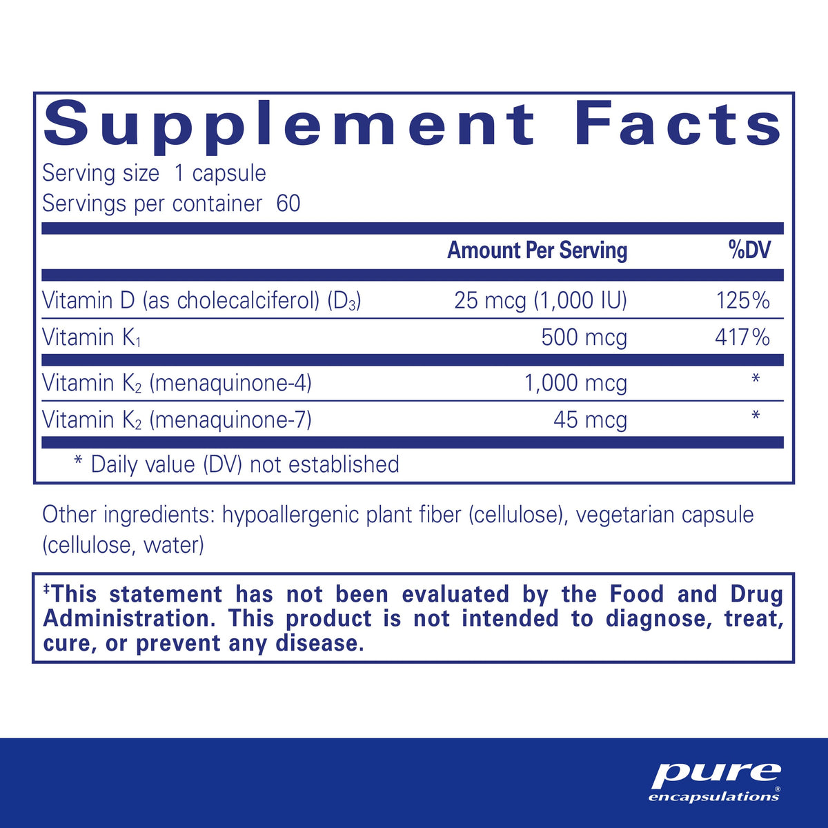 Ingredients: Each serving size 1 vegetarian capsule contains Vitamin D as cholecalciferol D3 25 mcg 1,000 IU, Vitamin K as vitamin K1 500 mcg, Vitamin K2 menaquinone4 1,000 mcg, Vitamin K2 menaquinone7 45 mcg. Other ingredients hypoallergenic plant fiber cellulose, vegetarian capsule cellulose, water.