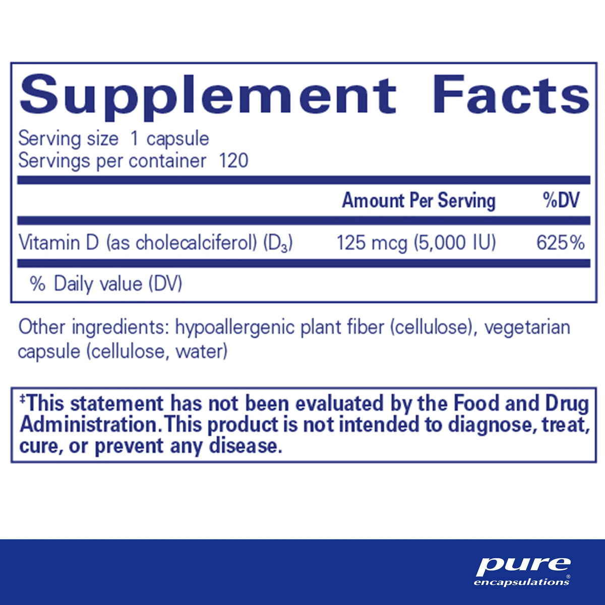 Ingredients :: Each serving size (1 vegetarian capsule) contains: Vitamin D (as cholecalciferol)(D3) 125 mcg (5,000 IU). Other ingredients: Hypoallergenic plant fiber (cellulose), vegetarian capsule (cellulose, water).