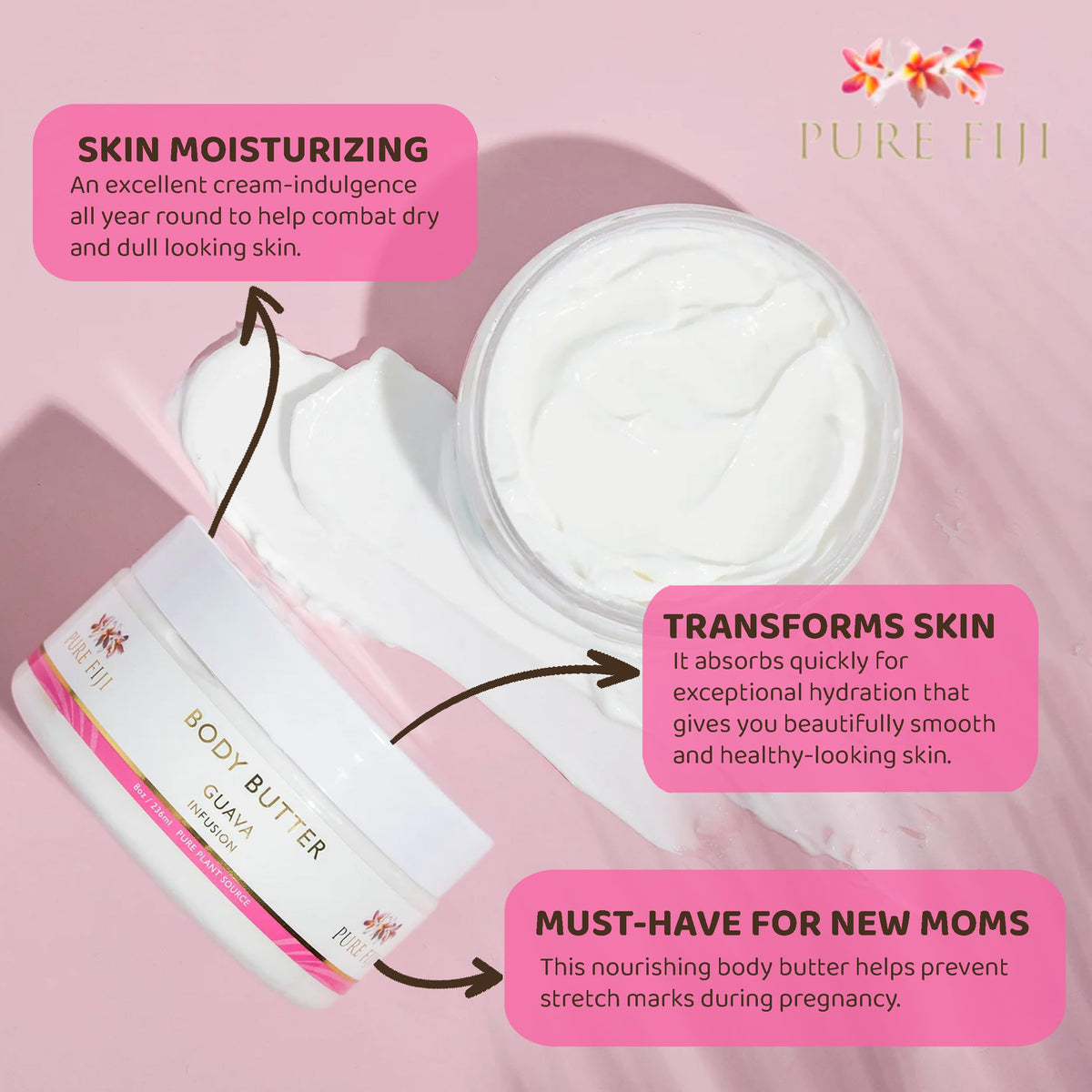 PURE FIJI Body Butter is a luxurious moisturizer enriched with natural oils and Vitamin E. This Guava-scented body butter is a perfect solution for dry skin, offering intense hydration and nourishment for both women and men.