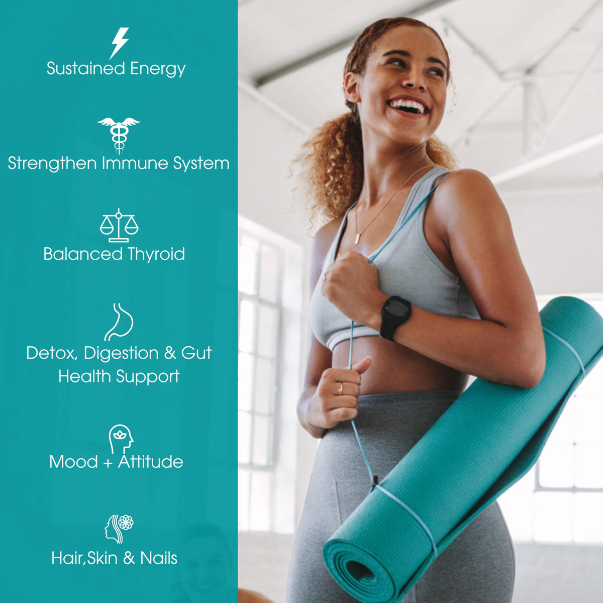 Ingredients: Organic Irish Moss, Organic Bladderwrack, Organic Burdock, BioPerine Black Peper Extract, Pullulan Capsules