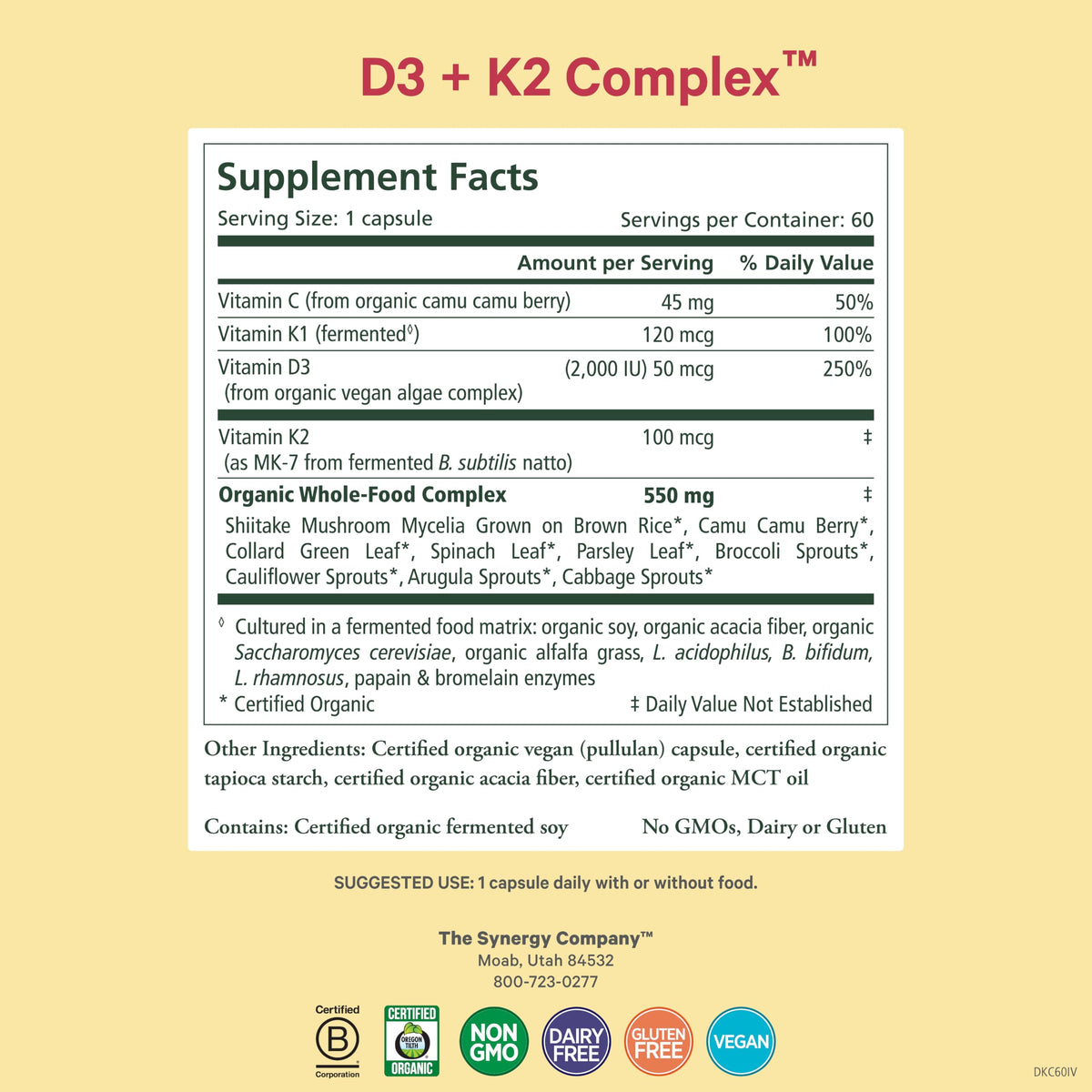 PURE SYNERGY D3 + K2 Complex is a vegan vitamin supplement that supports bone, brain, and immune health. Each pack contains 60 capsules with organic D3, vitamin K2 and K1, plus organic whole foods for holistic well-being.