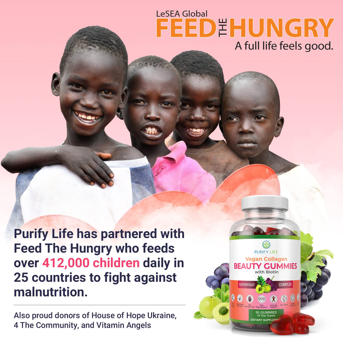 Purify Life Vegan Collagen Gummies with Biotin Vitamins provide essential nutrients for healthy hair, skin, and nails. These 90 chews are packed with a Collagen Support Superfruit Complex including Resveratrol, Vitamin A, E, and C.