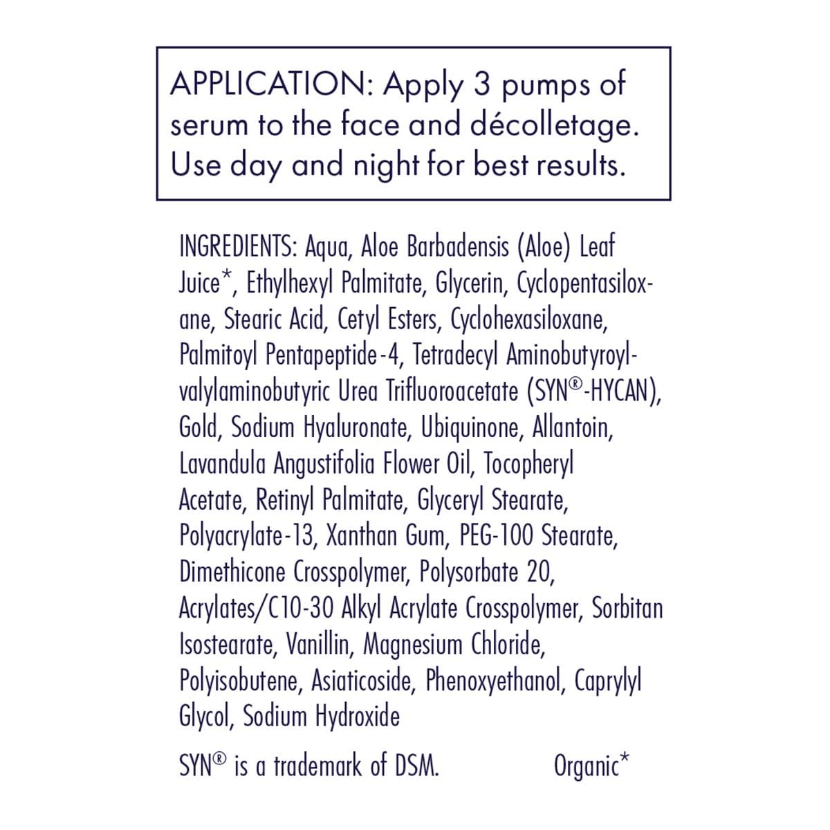 Ingredients: Aloe Barbadensis Aloe Leaf Juice, Aqua, Ethylhexyl Palmitate, Glycerin, Isododecane, Stearic Acid, Cetyl Esters, Tetradecyl Aminobutyroylvalylaminobutyric Urea Trifluoroacetate, Acetyl Heptapeptide9, Colloidal Gold, Sodium Hyaluronate, Ubiquinone, Retinyl Palmitate, Tocopherol, Lavandula Angustifolia Flower Oil, Allantoin, Xanthan Gum, Magnesium Chloride, Polyisobutene, Dimethicone Crosspolymer3, Polyacrylate13, Sorbitan Isostearate, Ceteth10, Laureth4, Polysorbate 20, Caramel, Vanillin, Phenoxyethanol, Caprylyl Glycol, Sodium Hydroxide.