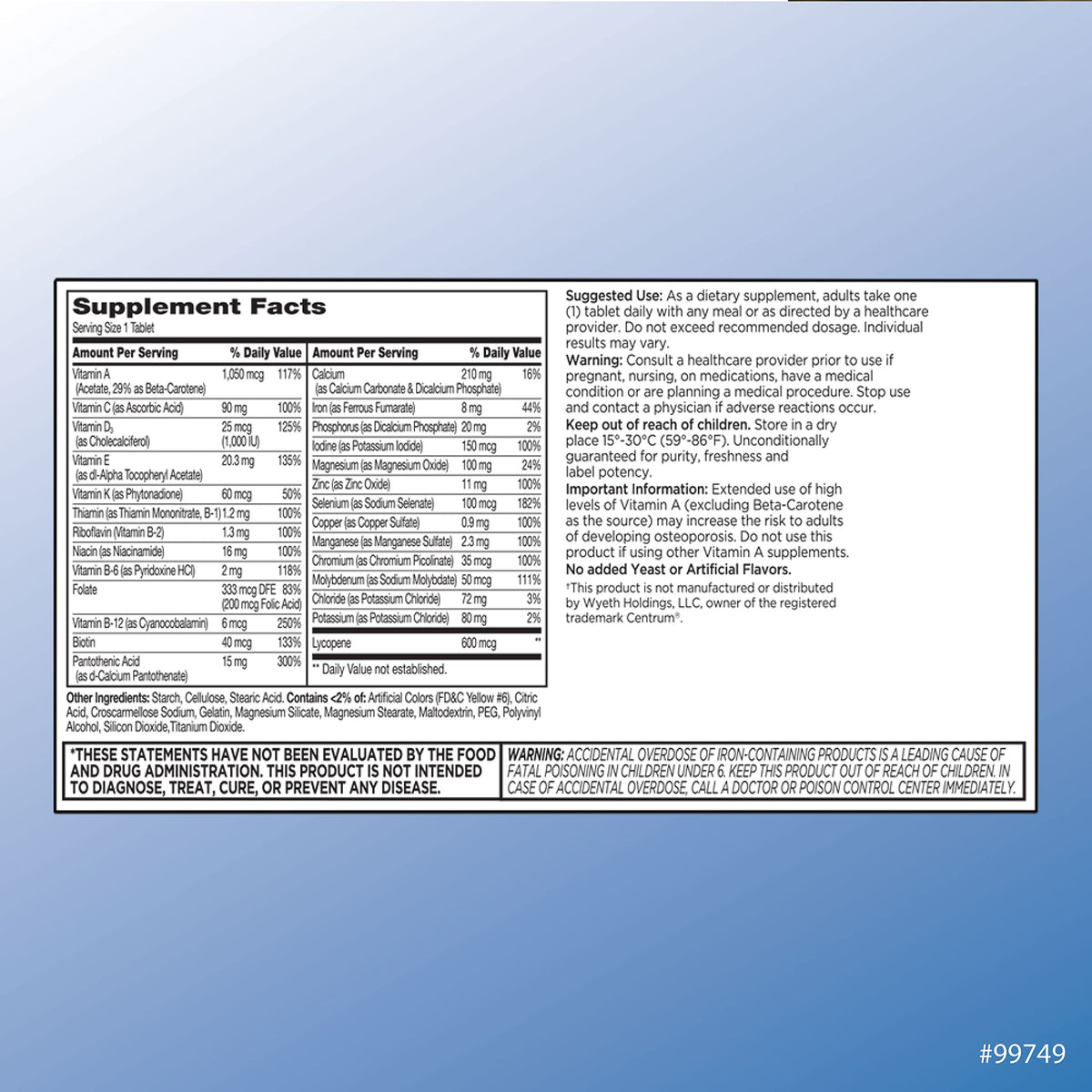 Ingredients :: Vitamin A; Calcium; Vitamin C (as Ascorbic Acid); Iron (as Ferrous Fumarate); Vitamin D; Phosphorus (as Dicalcium Phosphate); lodine (as Potassium Iodide); Vitamin E; 135% Magnesium (as Magnesium Oxide) 100 mg; Zinc (as Zinc Oxide); Vitamin K (as Phytonadione); Selenium (as Sodium Selenate); Thiamin (as Thiamin Mononitrate, B-1)1.2 mg; Copper (as Copper Sulfate); Riboflavin (Vitamin B-2); Manganese (as Manganese Sulfate) 2.3 mg; Niacin (as Niacinamide); Chromium (as Chromium Picolinate) 35 mcg; Vitamin B-6 (as Pyridoxine HCl); Folate; Molybdenum (as Sodium Molybdate) 50 mcg Chloride (as Potassium Chloride); Vitamin B-12 (as Cyanocobalamin) 6 mcg; Potassium (as Potassium Chloride); Biotin; 133% Lycopene; Pantothenic Acid; Other Ingredients: Starch, Cellulose, Stearic Acid. Contains <2% of: Artificial Colors (FD&C Yellow #6), Citric Acid, Croscarmellose Sodium, Gelatin, Magnesium Silicate, Magnesium Stearate, Maltodextrin, PEG, Polyvinyl Alcohol, Silicon Dioxide, Titanium Dioxide.