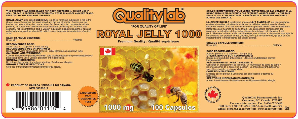 Experience the royal touch with QUALITYLAB Royal Jelly 1000 mg. These softgel capsules, made in Canada, offer the benefits of royal jelly in a convenient form, supporting overall health and vitality.