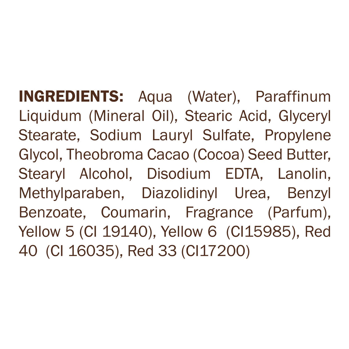 Ingredients :: Water (aqua), mineral oil, stearic acid, glyceryl stearate, sodium lauryl sulfate, propylene glycol, theobroma cacao (cocoa) seed butter, stearyl alcohol, fragrance (parfum), lanolin, methylparaben, disodium EDTA, diazolidinyl urea, FD&C yellow no. 5 (CI# 19140), FD&C yellow no. 6 (CI# 15985), FD&C red no. 40 (CI# 16035), FD&C red no. 33 (CI# 17200).