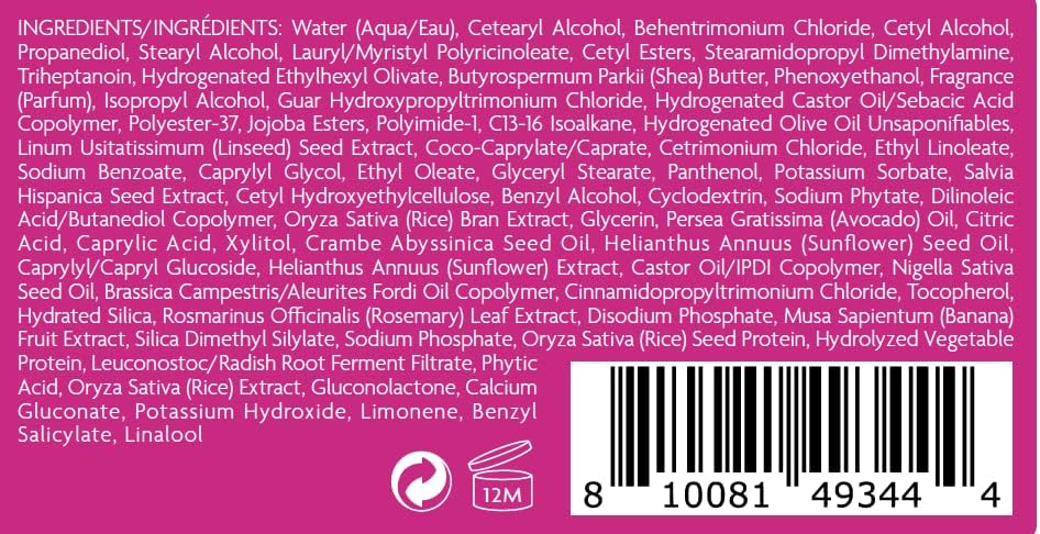 Ingredients: Water AquaEau, Cetearyl Alcohol, Behentrimonium Chloride, Cetyl Alcohol, Propanediol, Stearyl Alcohol, LaurylMyristyl Polyricinoleate, Cetyl Esters, Stearamidopropyl Dimethylamine, Triheptanoin, Hydrogenated Ethylhexyl Olivate, Butyrospermum Parkii Shea Butter, Phenoxyethanol, Fragrance Parfum, Isopropyl Alcohol, Guar Hydroxypropyltrimonium Chloride, Hydrogenated Castor OilSebacic Acid Copolymer, Polyester37, Jojoba Esters, Polyimide1, C1316 Isoalkane, Hydrogenated Olive Oil Unsaponifiables, Linum Usitatissimum Linseed Seed Extract, CocoCaprylateCaprate, Cetrimonium Chloride, Ethyl Linoleate, Sodium Benzoate, Caprylyl Glycol, Ethyl Oleate, Glyceryl Stearate, Panthenol, Potassium Sorbate, Salvia Hispanica Seed Extract, Cetyl Hydroxyethylcellulose, Benzyl Alcohol, Cyclodextrin, Sodium Phytate, Dilinoleic AcidButanediol Copolymer, Oryza Sativa Rice Bran Extract, Glycerin, Persea Gratissima Avocado Oil, Citric Acid, Caprylic Acid, Xylitol, Crambe Abyssinica Seed Oil, Helianthus Annuus Sunflower Seed Oil, CaprylylCapryl Glucoside, Helianthus Annuus Sunflower Extract, Castor OilIPDI Copolymer, Nigella Sativa Seed Oil, Brassica CampestrisAleurites Fordi Oil Copolymer, Cinnamidopropyltrimonium Chloride, Tocopherol, Hydrated Silica, Rosmarinus Officinalis Rosemary Leaf Extract, Disodium Phosphate, Musa Sapientum Banana Fruit Extract, Silica Dimethyl Silylate, Sodium Phosphate, Oryza Sativa Rice Seed Protein, Hydrolyzed Vegetable Protein, LeuconostocRadish Root Ferment Filtrate, Phytic Acid, Oryza Sativa Rice Extract, Gluconolactone, Calcium Gluconate, Potassium Hydroxide, Limonene, Benzyl Salicylate, Linalool