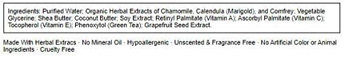 Ingredients :: Purified water; organic extracts of chamomile, calendula (marigold), and comfrey; vegetable glycerine, shea butter; coconut butter; soy extract; retinyl palmitate (vitamin A); ascorbyl palmitate (vitamin C); tocopherol (vitamin E); phenoxytol (green tea); grapefruit seed extract.