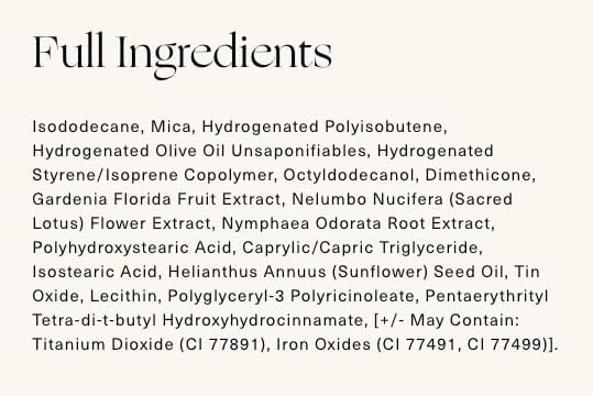 Ingredients: Isododecane, Mica, Hydrogenated Polyisobutene, Hydrogenated Olive Oil Unsaponifiables, Hydrogenated StyreneIsoprene Copolymer, Octyldodecanol, Dimethicone, Gardenia Florida Fruit Extract, Nelumbo Nucifera Sacred Lotus Flower Extract, Nymphaea Odorata Root Extract, Polyhydroxystearic Acid, CaprylicCapric Triglyceride, Isostearic Acid, Helianthus Annuus Sunflower Seed Oil, Tin Oxide, Lecithin, Polyglyceryl3 Polyricinoleate, Pentaerythrityl Tetraditbutyl Hydroxyhydrocinnamate, May Contain Titanium Dioxide CI 77891, Iron Oxides CI 77491, CI 77499.
