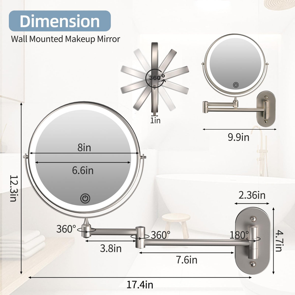 Rechargeable Wall Mounted Lighted Makeup Vanity Mirror 8 inch 1X/10X Magnifying Mirror with 3 Color Lights, Double Sided Bathroom Mirror with Dimmable LED Lights, Shaving Light up Mirror Brush Nickel