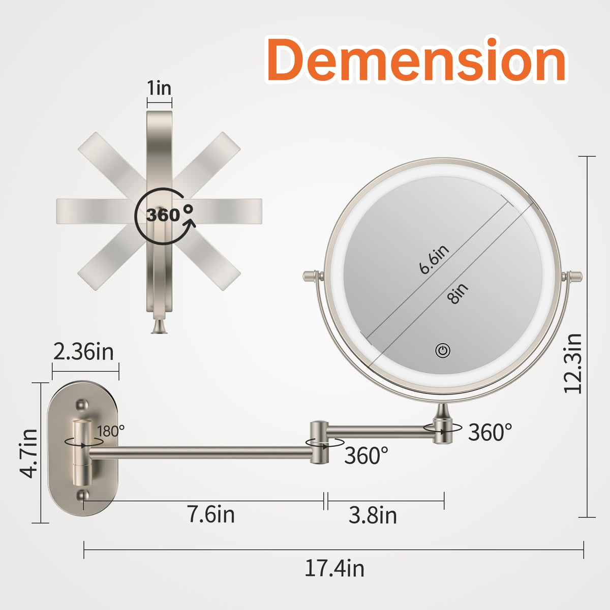 Illuminate your beauty routine with the Rechargeable Wall Mounted Lighted Makeup Vanity Mirror. This 8-inch double-sided mirror with 1X and 10X magnification, 3 color lighting, touch screen dimming, and extended arm 360 rotation is perfect for flawless makeup application.